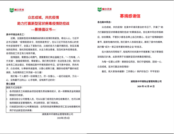 一方有难,八方支援,点滴汇聚,爱心汪洋。自从全国新型冠状病毒感染的肺炎疫情发生后,在以习近平同志为核心的党中央坚强领导下,全国上下紧急行动,疫情的每一个进展都深深牵动着每一个中国人的心。在美中环境党委积极响应与组织下,公司向全体员工发出了《美中环境抗击疫情募捐倡议书》,倡议美中环境全体员工积极为前线抗疫募捐,让每一位员工的绵薄之力汇集成爱的海洋输送到抗疫前线。