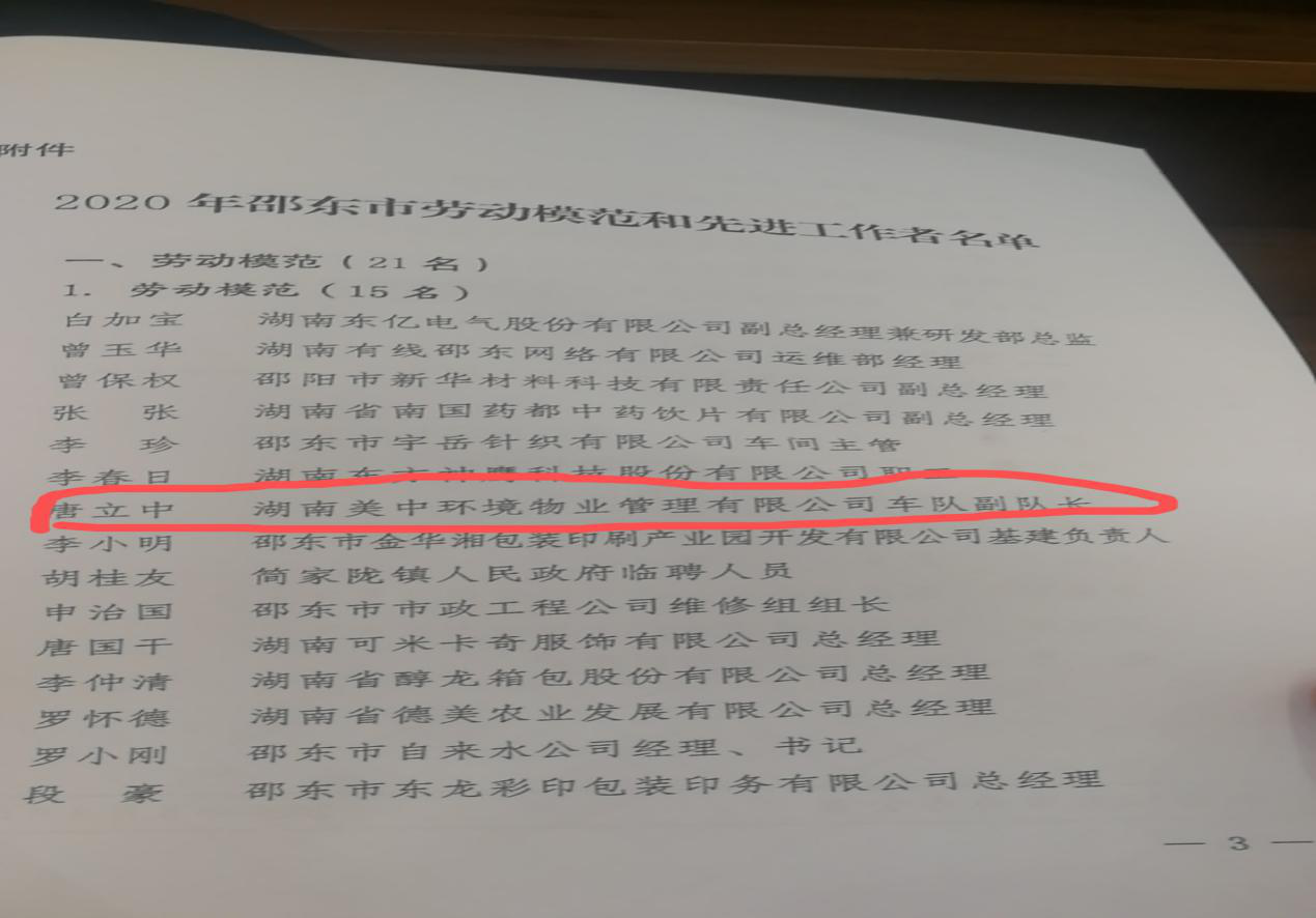 五一前夕,邵东市总工会发文决定表彰2020年“邵东市五一劳动奖章”和“邵东市劳动模范”,美中环境唐立中同志榜上有名!